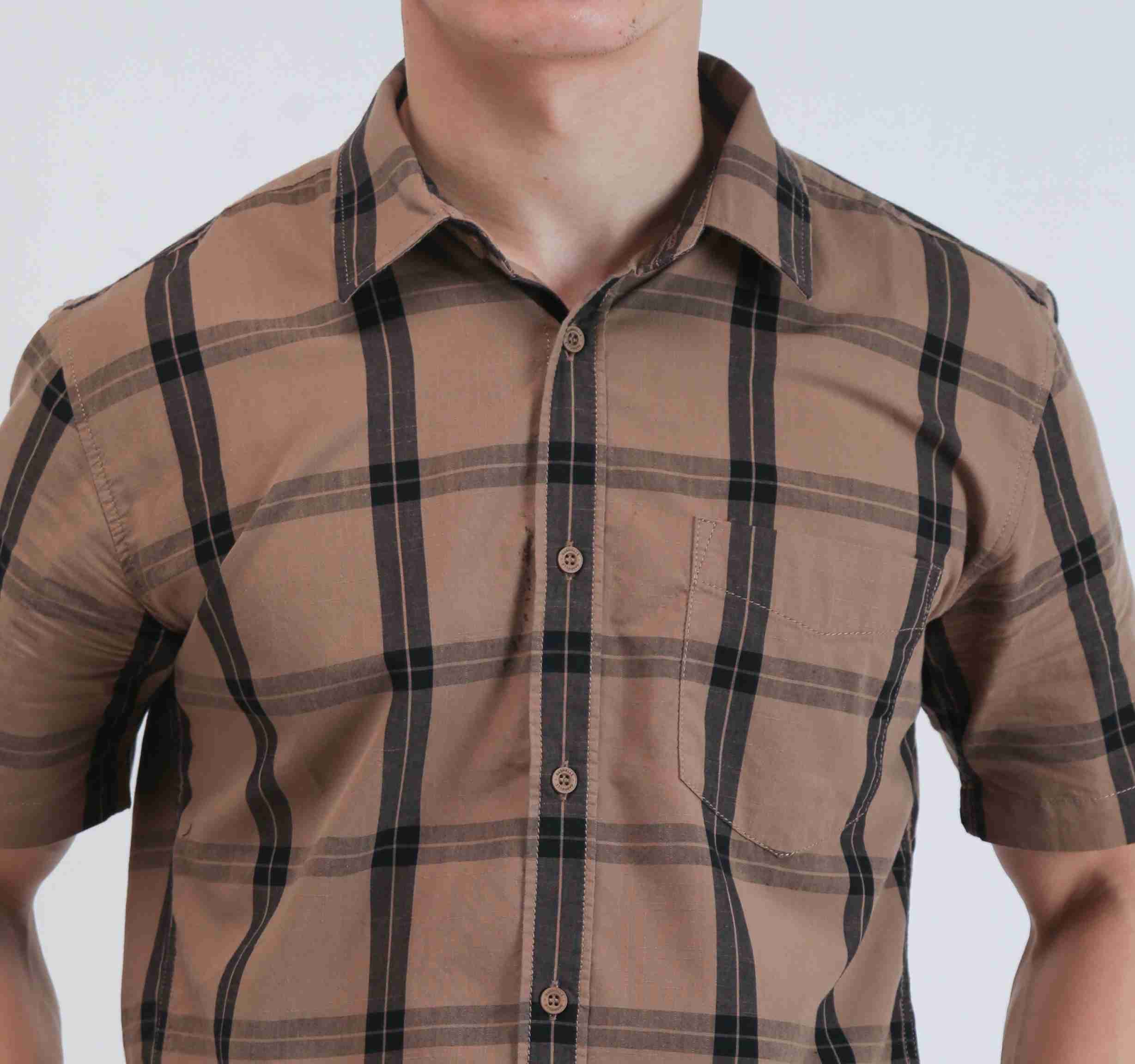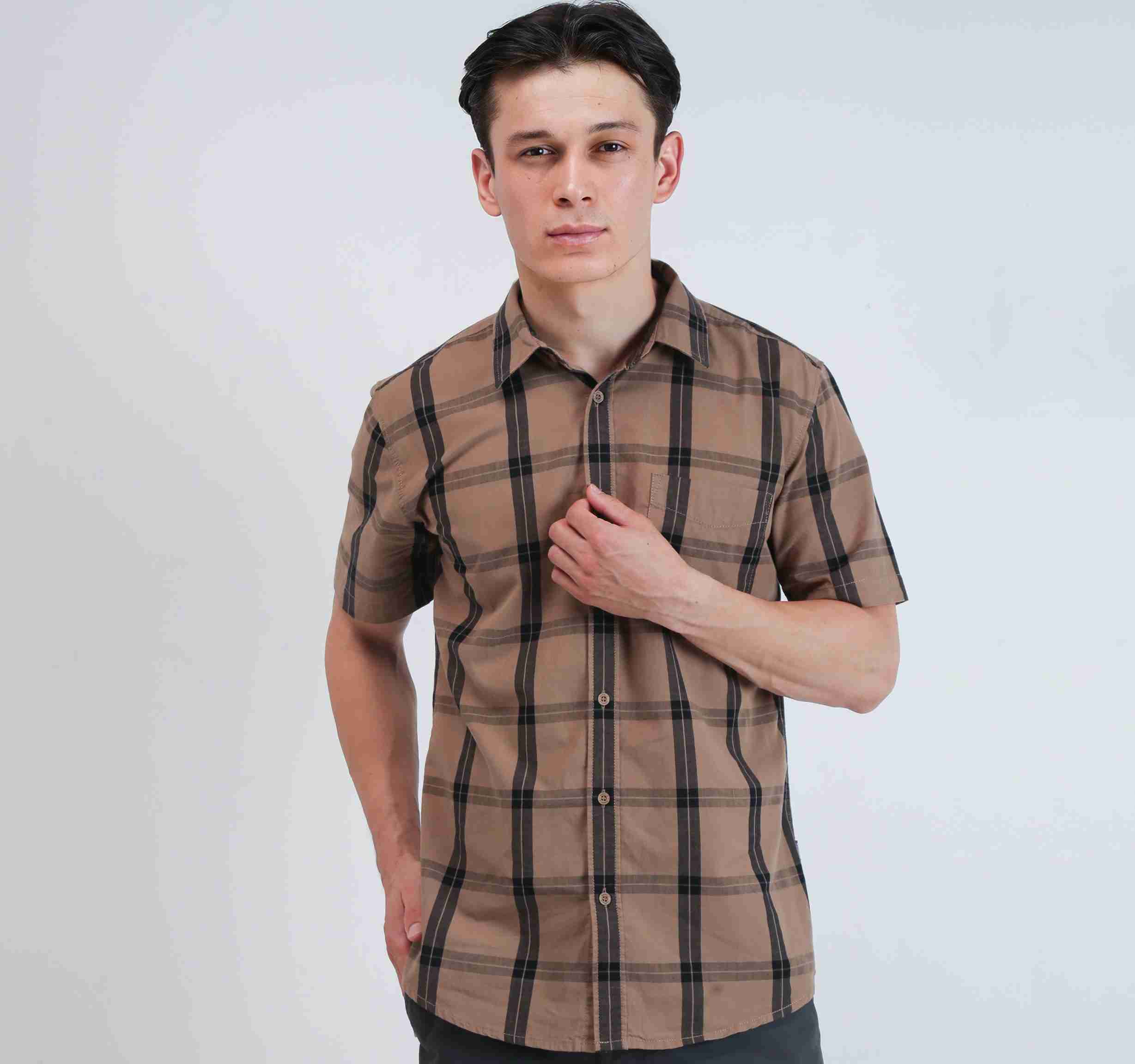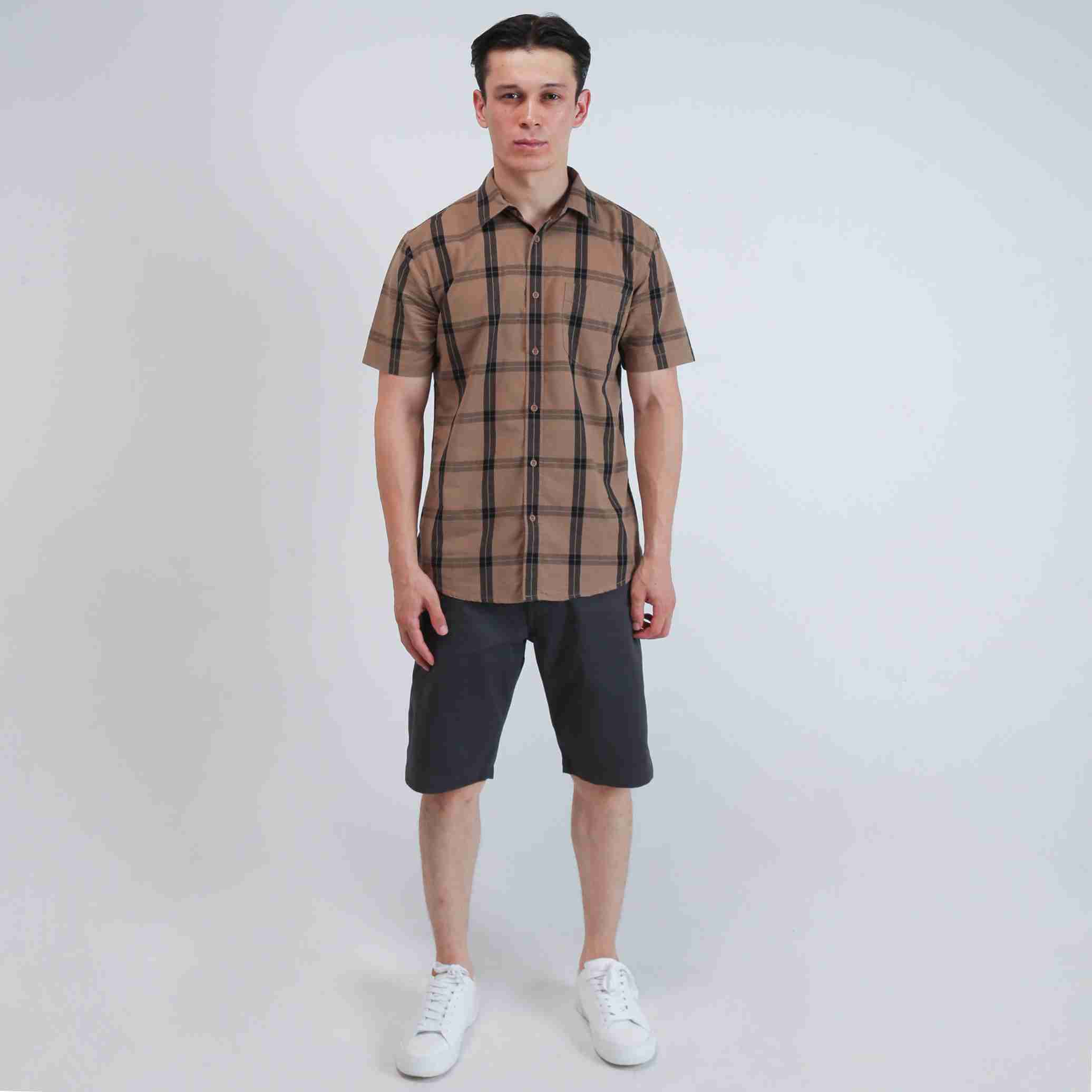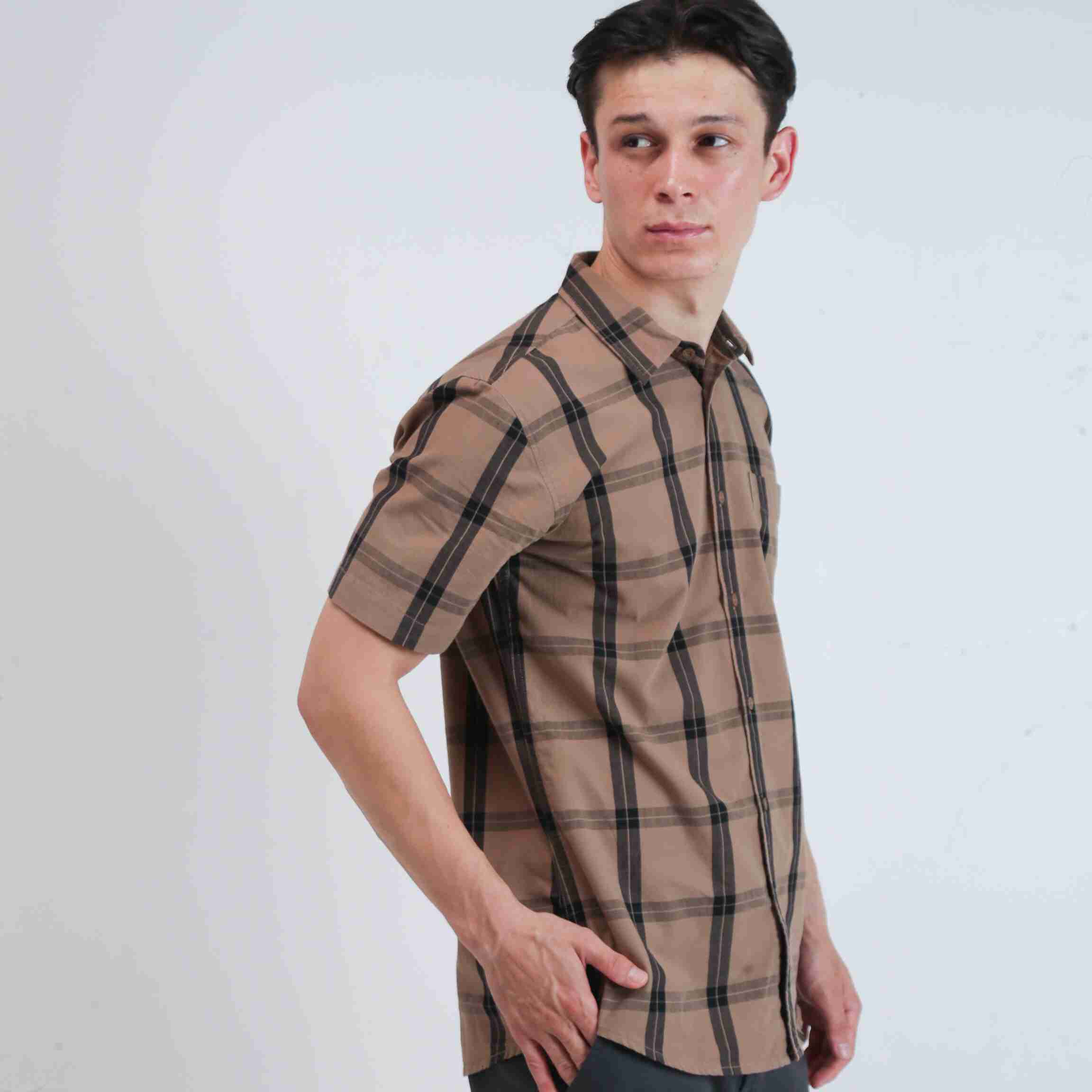 KEMEJA PRIA LENGAN PENDEK MOTIF KOTAK REGULAR FIT ; Bahan : 100% COTTON ; Warna : LIGHT BROWN ; Fitting : REGULAR ; Tipe Kain : RIGID